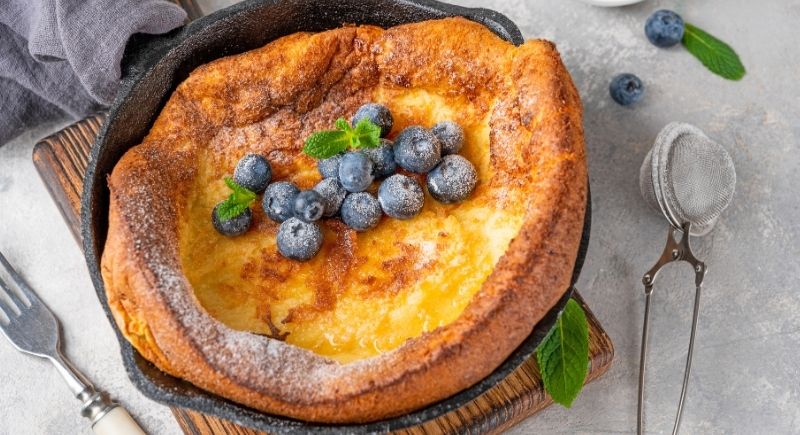 Dutch babies look dramatic when they rise in a hot skillet, but the batter is more of a basic pancake mixture. Eggs, flour, milk, and sugar form the base. The pan heats in the oven before the batter goes in, which creates steam that pushes the pancake upward. A dusting of powdered sugar or a handful of berries can turn it into a brunch centerpiece.
