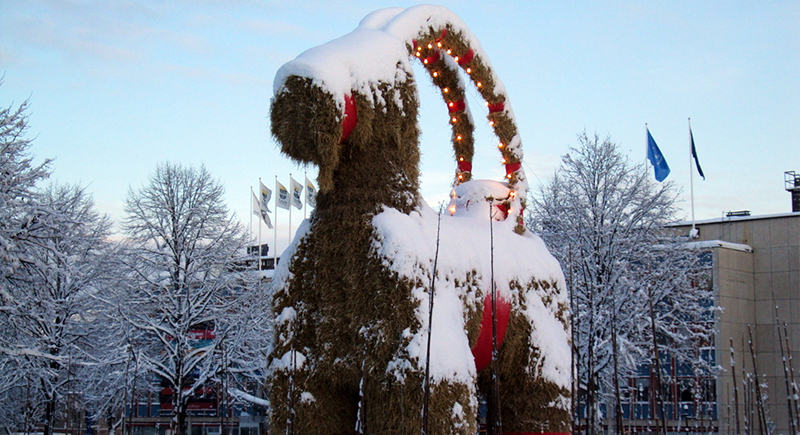 In Gävle, Sweden, a massive straw goat called the Gävle Goat kicks off the Christmas season. Built in early December, this towering Yule Goat stands in the town square as a festive symbol, and a frequent target of mischief, since pranksters often try to burn it down before Christmas.