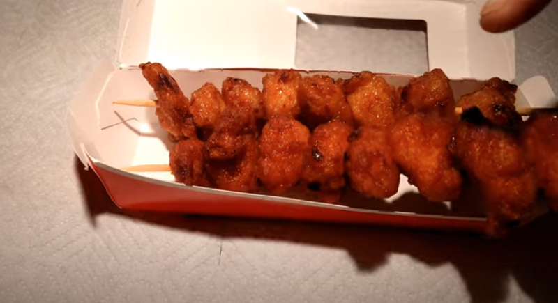 Technically, they’re chunks of chicken on a stick, but don’t let that stop you. The honey glaze isn’t cloying, and the heat kicks in at the right time. When fresh, the coating stays crisp, and the inside is juicy enough to feel like real food.