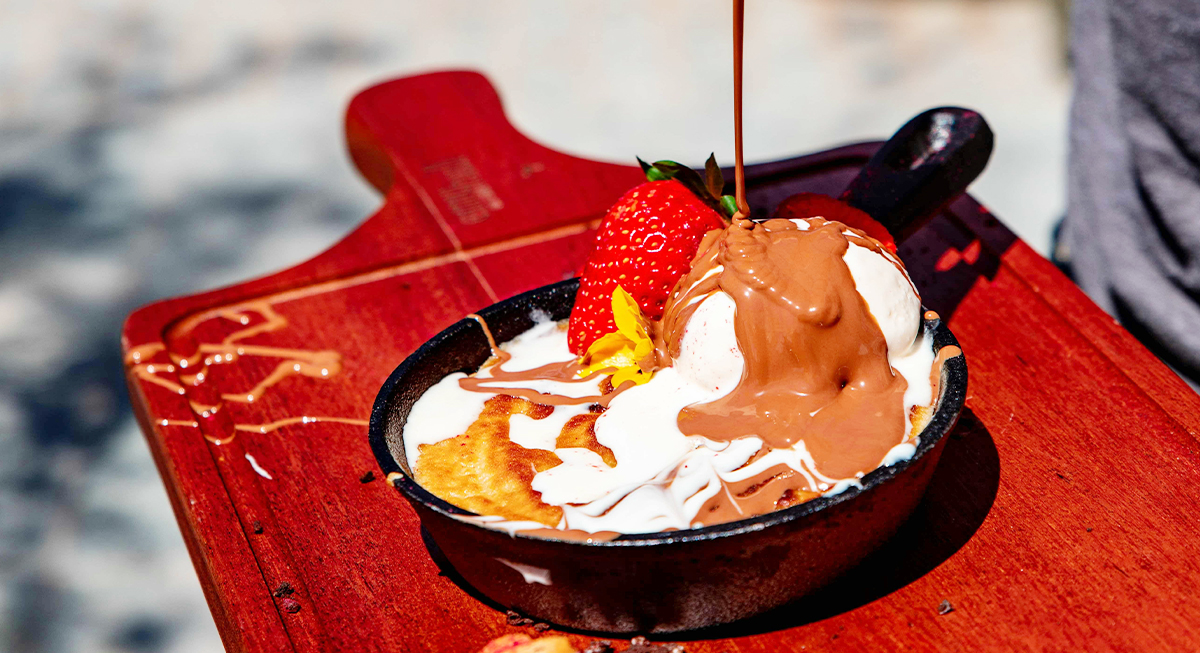 BJ’s classic chocolate chunk Pizookie is topped with vanilla ice cream. But then, crispy pepperoni and a drizzle of Mike’s hot honey sauce take it in a completely different direction. The sudden change is the whole appeal.
