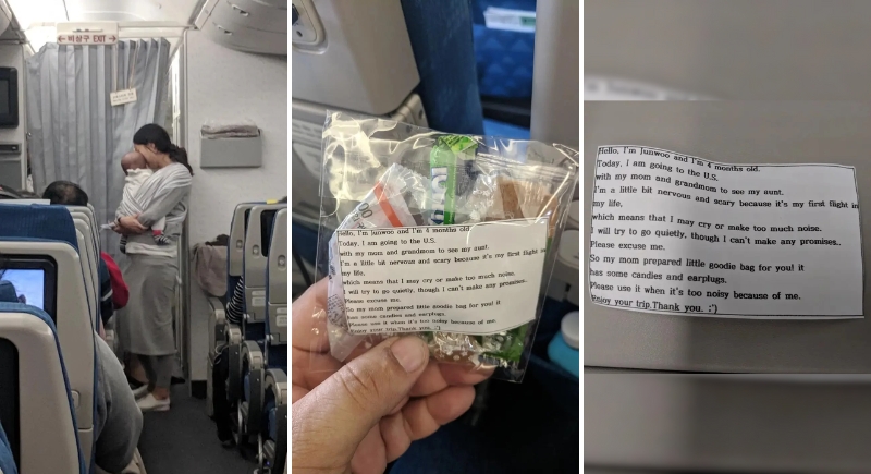 The standout feature in every bag was a small note written in the voice of her baby, Junwoo. It asked passengers for their patience and invited them to use earplugs if needed. This note was printed and carefully packed into more than 200 small bags, all assembled by the mother herself. She carried those bags on board along with all the usual baby travel gear. It’s not known if she repeated this process for her return flight, but the original effort alone raised questions about expectations placed on parents in public. The attention to detail was what made the gesture so widely discussed once it went viral on social media.