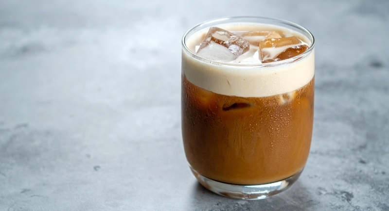 Iced oat milk hot chocolate served with a cream-filled Snoballs cake on top. The combination doubles as a drink and dessert.