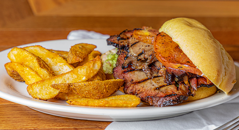 Brisket, BBQ corn chips, pickles, and barbecue sauce on a spiral croissant bun. Curly fries come along too. Guests who enjoy sandwiches with plenty of texture usually call this their favorite.