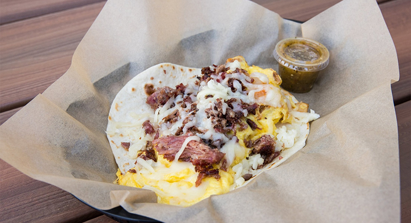 Technically a taco, but too generous to leave out. The Wrangler combines scrambled eggs, smoked brisket, potatoes, and cheese in a tortilla that barely contains them. It’s smoky, rich, and satisfying. Torchy’s might call it a taco, but anyone who’s eaten one knows it plays in burrito territory.
