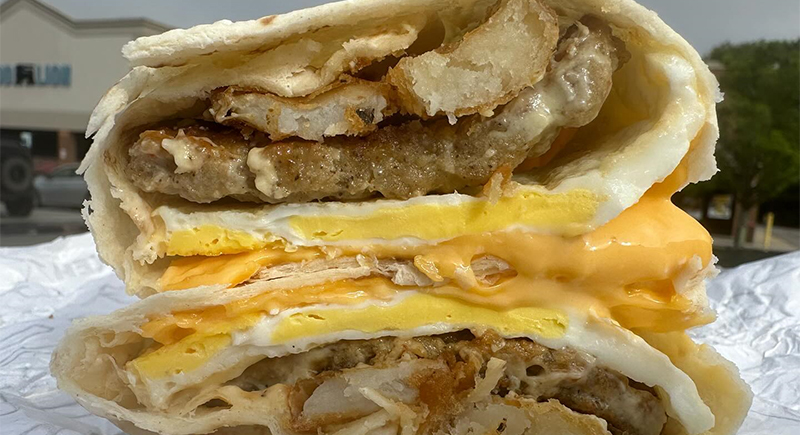 It lives up to the name. Eggs, sausage, bacon, hash browns, and a punchy sauce fill a tortilla that barely holds it all. The flavor’s big, the texture’s messy, and it’s best eaten straight off the griddle. It’s not subtle, but that’s the whole point.
