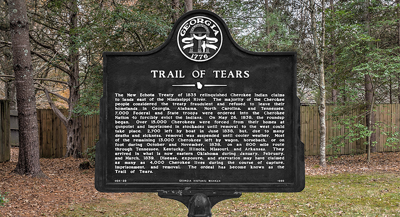 Cherokee people were forced out of Georgia after the state ignored a Supreme Court ruling protecting their land. Under federal orders, thousands marched westward in harsh conditions, and many died of disease, hunger, or exposure. The forced journey became known as the Trail of Tears and began in northern Georgia.