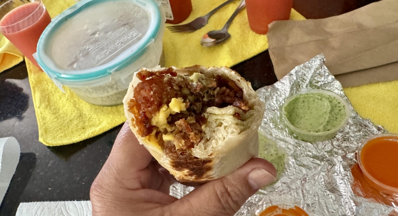 Del Taco does breakfast burritos so big, you can call them lunch. Eggs, cheese, bacon, and potatoes get wrapped into oversized packages that are described as “ambitious if sometimes overloaded.” But burrito lovers aren’t complaining because for them, it’s a reason to get out of bed in the morning.