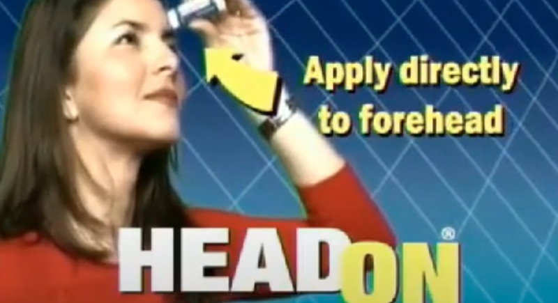 This commercial repeated one sentence three times with no explanation: “HeadOn. Apply directly to the forehead.” The visuals were basic, and there was no voiceover beyond the looped phrase. It may have been irritating, but it made the product popular.
