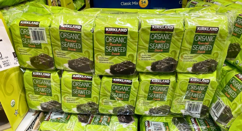 These roasted seaweed snack packs come in handy single-serve portions. They are crunchy, salty, packed with flavor, and easy to carry, making them a fun alternative to chips. At Costco, you get a large box with many packs for under $5. They are great for quick lunches, snacks, or school bags.