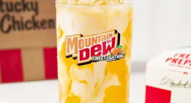KFC’s Mountain Dew Sweet Lightning Peaches & Cream Soda sounds unusual, but it works surprisingly well. Peach flavor, combined with Mountain Dew’s citrusy bite and vanilla cream, smooths it all out.