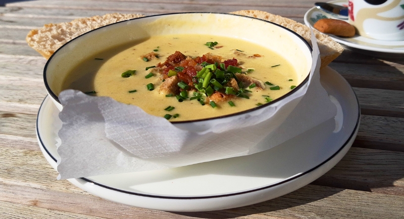 Every folding table in the fellowship hall had at least one slow cooker of potato soup, creamy and steaming, ladled out next to baskets of white bread and butter pats. Made from basics like potatoes, onions, milk, and margarine, it was easy to stretch and hard to mess up. Someone always added bacon, and another swore by Velveeta.