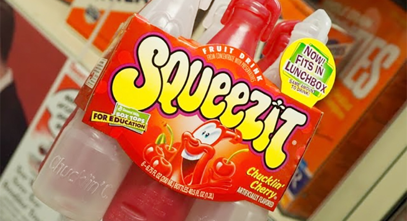 Squeezit drinks came in brightly colored plastic bottles shaped like cartoon characters, which felt fun until the taste kicked in. The flavors were aggressively artificial, somewhere between cough syrup and melted candy. Drinking one meant squeezing sugar straight into your mouth. Kids loved the novelty, but taste buds paid the price.