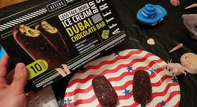 At select Costco locations, After’s Ice Cream rolled out its take on the Dubai dessert as a boxed ice cream bar. Like the viral version, the bar featured a hard chocolate shell with a pistachio-forward interior and bits of crispy kataifi for texture. It sold out quickly and didn’t stay on shelves long.