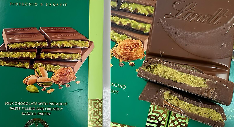 One of the biggest chocolate brands in the world entered the scene with a bar that blends milk chocolate and pistachio paste. Lindt’s version includes 45% pistachios along with almonds, hazelnuts, and kadayif (another name for kataifi). It’s now sold at major U.S. retailers like Target, Kroger, and Walgreens.