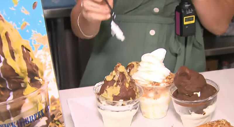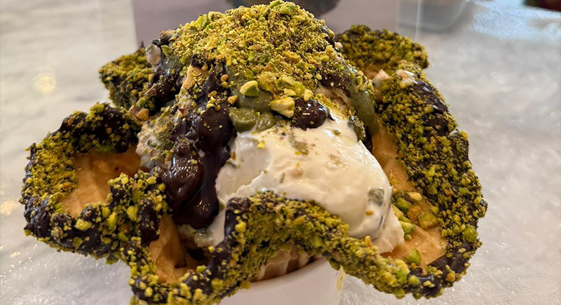 Marble Slab Creamery built a sundae around sweet cream ice cream to capture the appeal of the viral treat. It’s served in a chocolate-dipped waffle bowl dusted with pistachios, then layered with pistachio butter, chocolate, crunchy waffle pieces, and kataifi. The sundae had early tests in Texas and expanded nationwide due to customer demand.