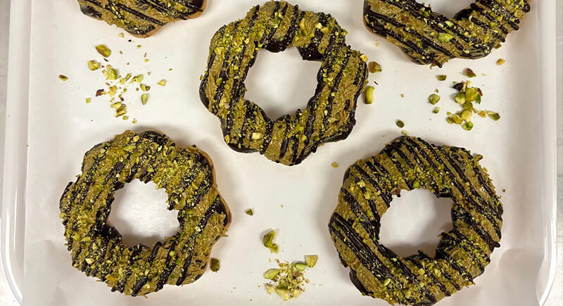 Instead of the usual cake or yeast, Paris Baguette used its signature mochi donut as the base. It’s topped with a thick spread of pistachio cream, milk chocolate, and crunchy kataifi. The donut leans into pistachio and strawberry without straying far from its Korean-French roots.
