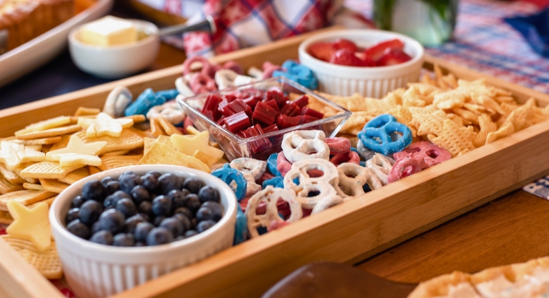 If you want the guests to snack, mingle, and graze without waiting for a full meal, build a color-themed charcuterie board. Use strawberries, blueberries, white cheese, crackers, and sliced meats to create a festive spread. Boards like this are easy to customize for different diets and add something eye-catching to the table.