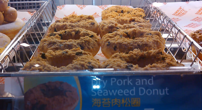 One of the most eyebrow-raising Dunkin’ Donuts versions is the dry pork and seaweed donut. It uses a standard yeast dough but swaps the sweet glaze for pork floss and strips of seaweed. The result is a salty, umami-heavy snack that pushes the boundaries of what a donut can be.