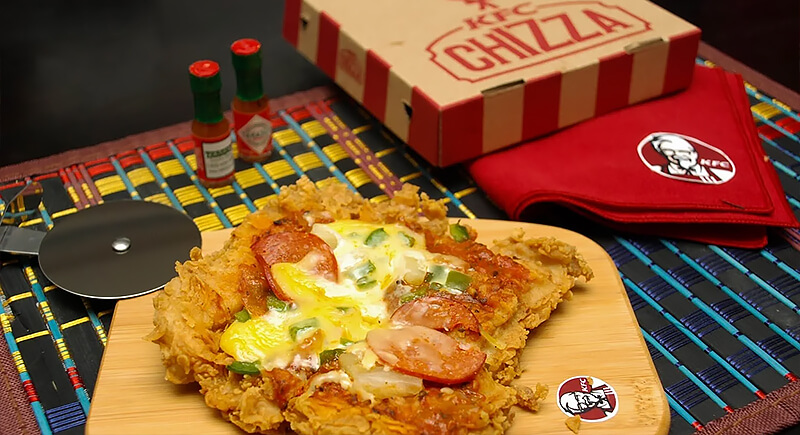 The Chizza is exactly what it sounds like: pizza built on fried chicken. KFC replaced the crust with a flattened fillet, then topped it with tomato sauce, mozzarella, and bits of ham or pineapple. It debuted in the Philippines, where the mix of salty, sweet, and crispy fit right in, before spreading across Asia as a limited-time hit.