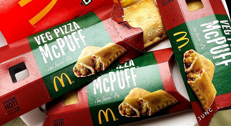 This snack combines Indian-style fast food with pizza flavors. The Pizza McPuff is a handheld pastry filled with tomato sauce, bell peppers, peas, carrots, and mozzarella. It’s completely vegetarian and shaped like a hot pocket, designed for quick eating.