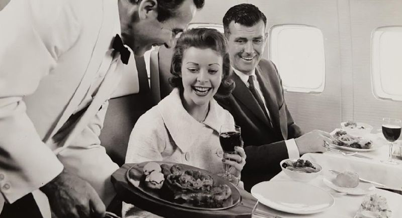 In the ’50s, jet travel picked up speed—and so did the competition. TWA and BOAC served lobster tails, filet mignon, and shrimp cocktails on china with real cutlery. Some even had chefs onboard. It was an experience designed to wow you before you even reached the runway.