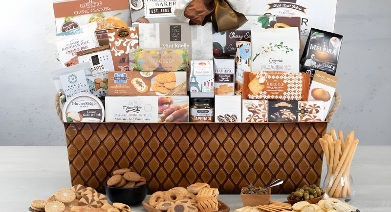 This basket adds rustic charm with gourmet treats tucked into a detailed metal container you can reuse long after the snacks are gone. Inside, you’ll find flavorful bites that pair well with a quiet evening or a casual get-together. It’s a tasteful option that blends style with delicious simplicity.