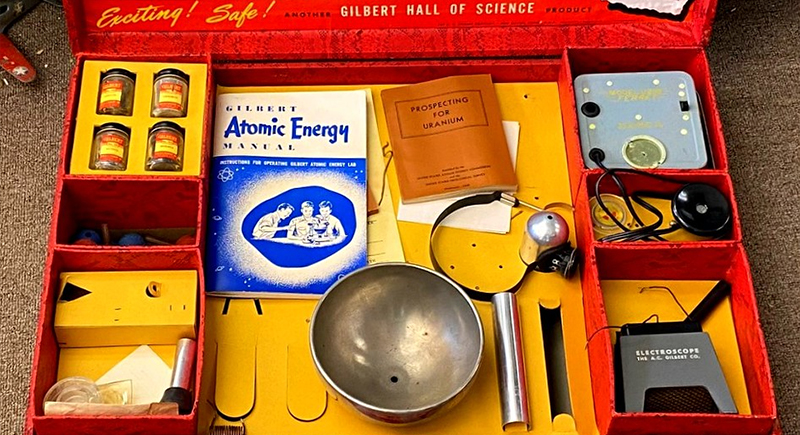 These science kits included real uranium ore, thorium samples, and functional radiation detectors. They were sold in department stores or mail-order catalogs, and promised hands-on learning about atomic energy. Prolonged exposure to the radioactive material, especially in confined spaces, carries serious health risks such as increased cancer risk and cellular damage.