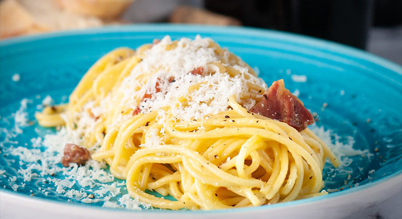 Cream in carbonara is a common visitor error. The traditional Roman version uses eggs, Pecorino Romano, guanciale, and black pepper. The creamy texture comes from mixing hot pasta with beaten egg and cheese. Extra ingredients like garlic or onions also don’t belong.
