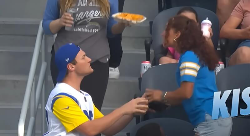 Fans watching the Los Angeles Rams play the Los Angeles Chargers in August 2024 saw a man’s big proposal implode on the jumbotron. He knelt in his spotless Puka Nacua jersey, but before she could answer, a passerby carrying nachos clipped him, which sent the cheese and toppings everywhere. Gasps swept through SoFi Stadium. When she shut the box and shook her head, the moment went from romantic to viral chaos within minutes.