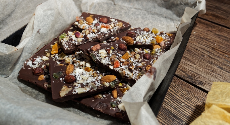 Chocolate bark handles tours better than a standard chocolate bar. Look for versions with nuts or fruit mixed in for extra crunch and energy. It’s less messy, breaks into pieces easily, and feels like a treat without turning your dashboard into a sticky situation.