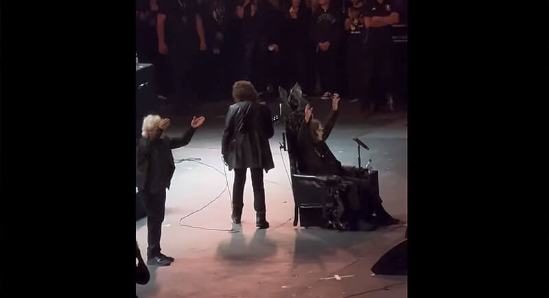 When the lights came up, Ozzy sat in a black leather chair, a gold armband flashing under the stage lights. Years of surgeries had taken their toll, but his grin didn’t fade. He joked between songs and still found ways to work the mic like the seasoned pro he is.