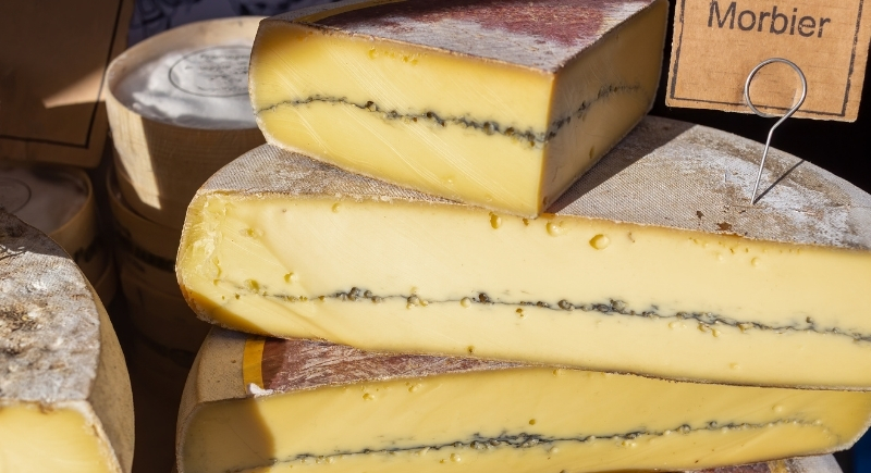 Morbier is recognizable by its thin ash line running through the center. Traditional farmhouse Morbier is often made with raw milk and aged in ways that may not meet U.S. microbial limits. While pasteurized versions exist, traditionalists argue they lack the depth produced by raw milk fermentation.