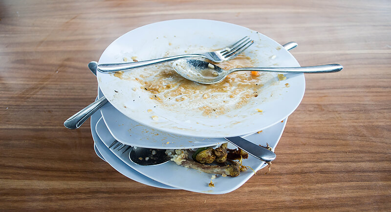 Customers sometimes pile plates and cups at the end of the meal to be helpful. However, servers have a specific way of clearing tables to avoid spills and broken dishes. Stacks make it harder to grip and carry safely. Just leave things where they are, and they’ll be taken care of.