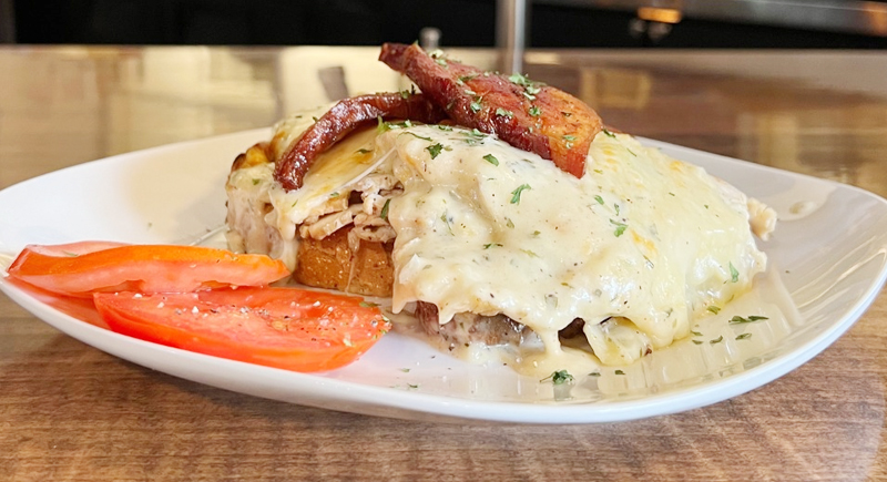 This dish, served open-faced at St. Louis’ Mayfair Hotel, layered sautéed mushrooms and shallots on toast, followed by ham or turkey, cheddar cheese sauce, and tomato slices. Finished with another sprinkle of cheese and broiled until golden, it was more of a fork-and-knife dinner than a grab-and-go.
