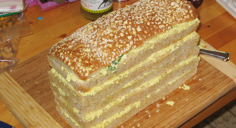 From the 1940s through the 1970s, the sandwich loaf was a centerpiece at parties. White bread was stacked with layers of fillings such as ham salad, egg salad, or shrimp salad, then coated in whipped cream cheese to resemble a frosted cake. When sliced, the cross-section revealed its layered colors, which often mattered more to hosts than the flavor.