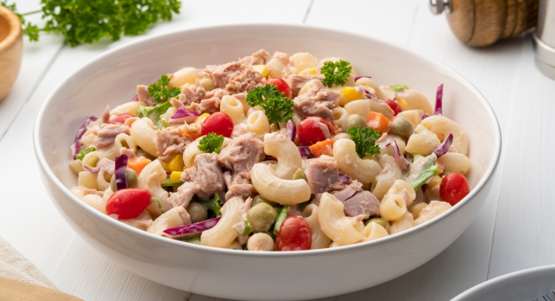 A staple of church picnics and lunchboxes, tuna macaroni salad mixed canned tuna, mayo, and elbow pasta. The updated version uses lemon aioli, fresh herbs, and albacore tuna packed in olive oil. It may have traded Tupperware for ceramic bowls, but the easygoing flavor still feels like summer on a budget.