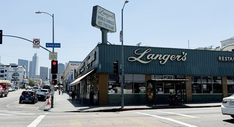 Langer’s opened in 1947 in Westlake. It serves hand‑sliced pastrami with Swiss cheese, coleslaw, and Russian dressing on double‑baked rye. This deli’s signature sandwich helped the shop earn a national James Beard Foundation mention; it was actually called the “Marilyn Monroe” of pastrami.