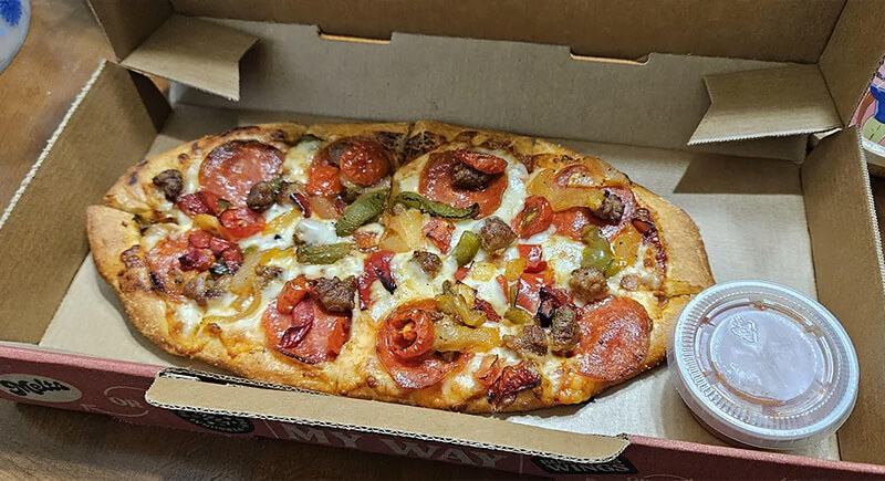 Pizza Hut’s Crafted Flatzz are crisp-edged personal pies in flavors like Chicken Bacon Ranch and Nashville Hot Chicken. They’re oval-shaped and meant to be eaten alone, not shared. Before 5 p.m., they drop to $5—ideal for early dinners or a one-person cheat meal that doesn’t leave leftovers.