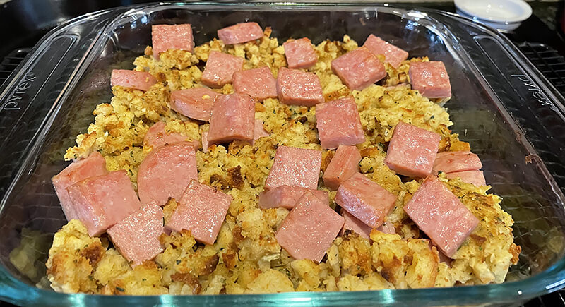 Instead of a standard casserole, moms layered cooked macaroni with thin slices of Spam in a loaf pan and baked it in a water bath. It held together well enough to slice and serve like meatloaf, especially when paired with a side of saucy vegetables to make the plate feel complete.