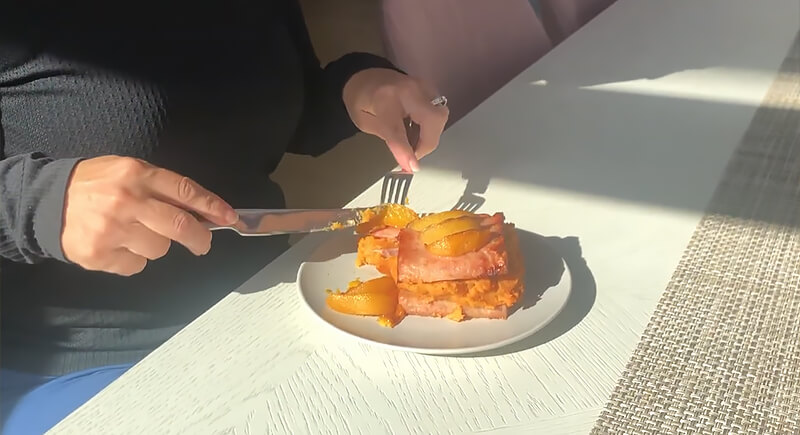 This dish had mashed sweet potatoes and thick slices of Spam in a stacked loaf that was drizzled with a peach-mustard glaze and ringed with canned peach slices. It was what happened when the pantry had fruit, but the fridge didn’t have meat.