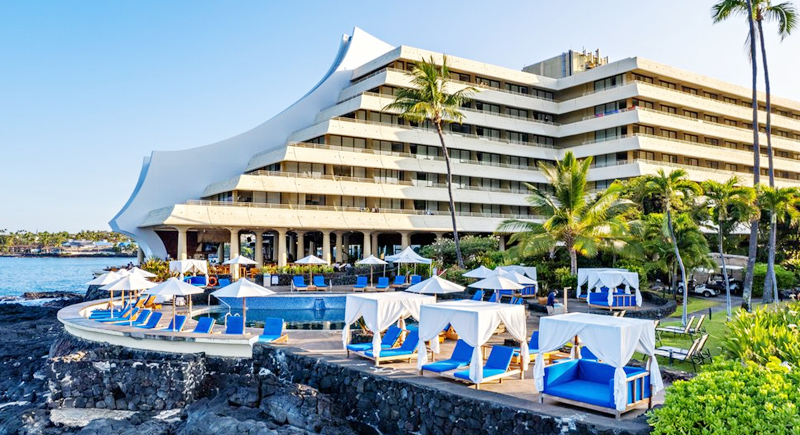 Set right along the water in Kailua-Kona, the Royal Kona Resort’s luau buffet pairs unlimited food with a full evening production. The spread includes kalua pork cooked underground, teriyaki beef, fresh island fish, tropical salads, and traditional sides like poi.