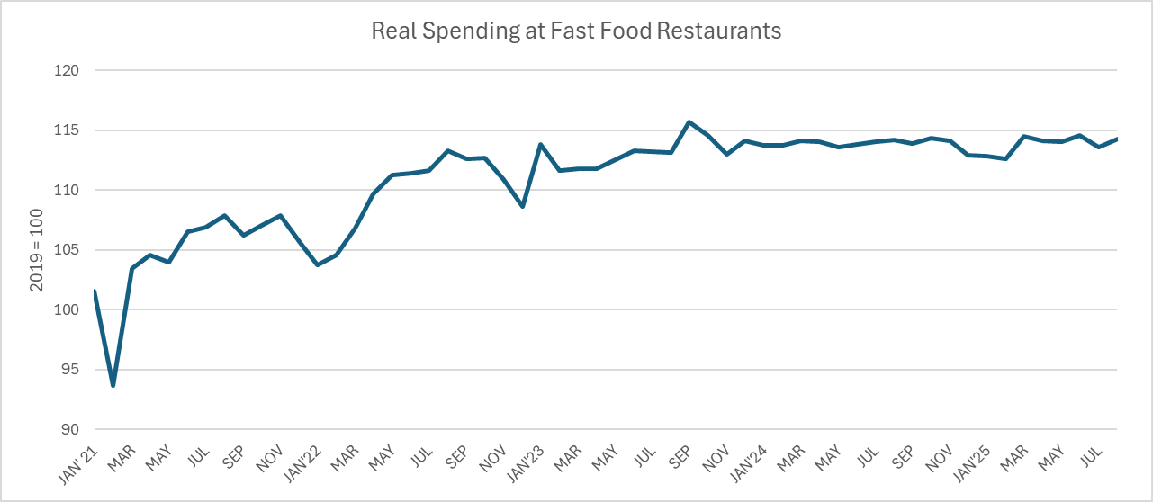 To understand why these chains are all making the same move at the same time, you have to look past the menu boards. According to Dean Baker at the Center for Economic and Policy Research, fast food is the right place to start if you want a real sense of what’s going on with the finances of average workers, not the high-income earners with stock portfolios to cushion them. And what the spending data shows is a clear and concerning pattern. After a few years of strong recovery, fast food spending hit a wall. Baker notes that spending really slowed down in 2024 and has essentially stagnated this year.