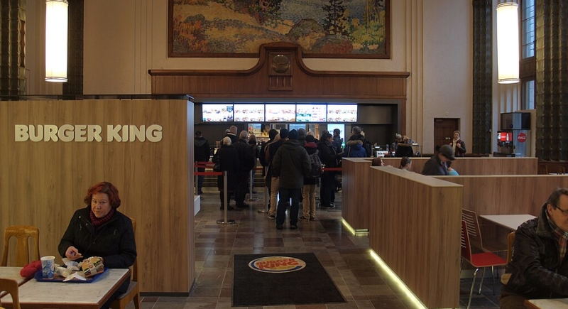 Helsinki’s Central Railway Station houses a Burger King inside a heritage building, first opened in 1919. High ceilings, chandeliers, and early-20th-century architectural details create a striking contrast with the modern ordering counter.