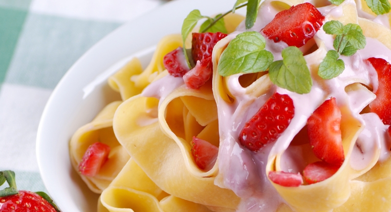 The dish is called makaron z truskawkami, which literally translates to pasta with strawberries. At its simplest, it is cooked pasta topped with mashed or sliced strawberries, sugar, and either sour cream or yogurt. It can be served warm, chilled, or somewhere in between.