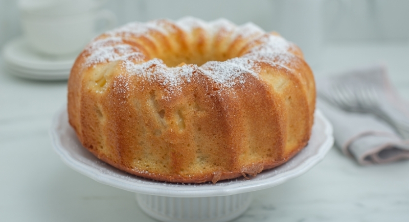The cake is baked in a Bundt pan. It’s just as delicious plain, with a dusting of powdered sugar, or served with whipped cream, fresh strawberries, or a scoop of ice cream. The texture is slightly crisp outside while staying moist and firm inside.
