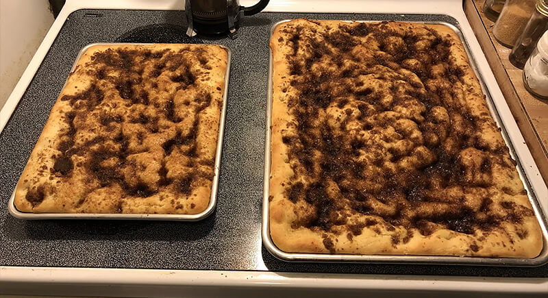 Moravian settlers in North Carolina didn’t even waste mashed potatoes. After being mixed into the yeasted dough, the spuds give this holiday coffee cake its thick, chewy texture. They’re topped with buttery brown sugar and cinnamon. Rise times are long, but the result is sweet, sticky, and worth it.