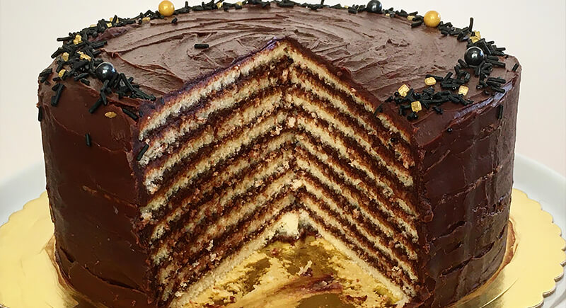 Why stop at three layers when you can have eight or more? That’s the philosophy behind this tall, fudge-frosted cake from Maryland’s Smith Island. It involves thin yellow cake layers stacked high with chocolate icing in between. Its variations have exploded since—everything from lemon cream to red velvet now gets the sky-high treatment.