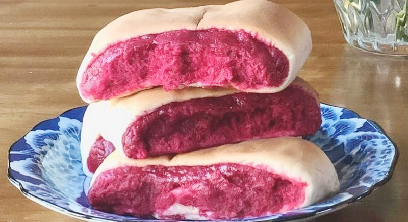 This Filipino bread, bright red in the center, goes by many names, including pan de regla, which means “menstrual bread.” It’s also called kalihim or “secret bread” because bakers used day-old bread as filling. Despite the eyebrow-raising nickname, it’s sweet and soft, commonly eaten for breakfast or as a snack.
