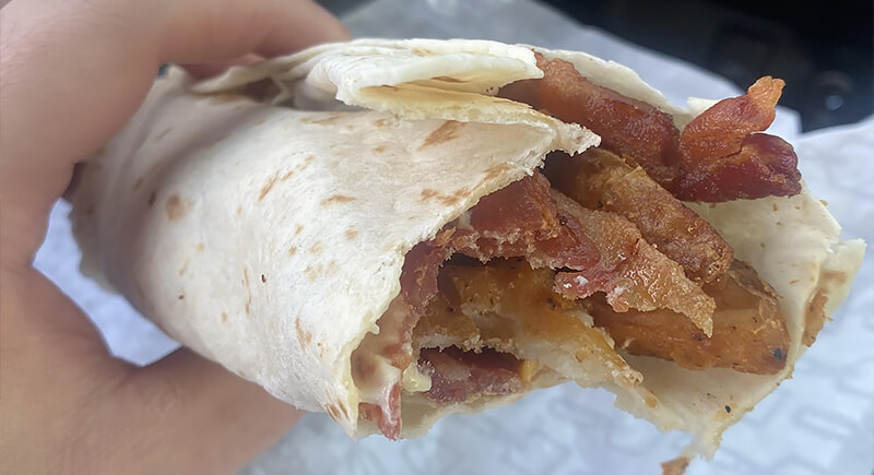 Potatoes, bacon, eggs, and cheese get wrapped into a soft flour tortilla, making this one of the heartier Wendy’s breakfasts. The mix tastes different with every bite, and a splash of Cholula hot sauce helps cut through the salt.