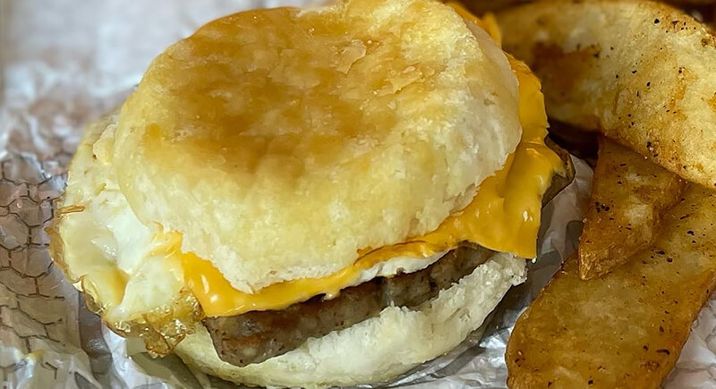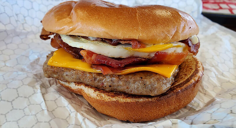 This is Wendy’s flagship breakfast sandwich for a reason. Sausage, bacon, American cheese, egg, and Swiss cheese sauce all stack between a pillowy bun. It’s indulgent without being chaotic. No single flavor overpowers the others, which makes every bite satisfying.